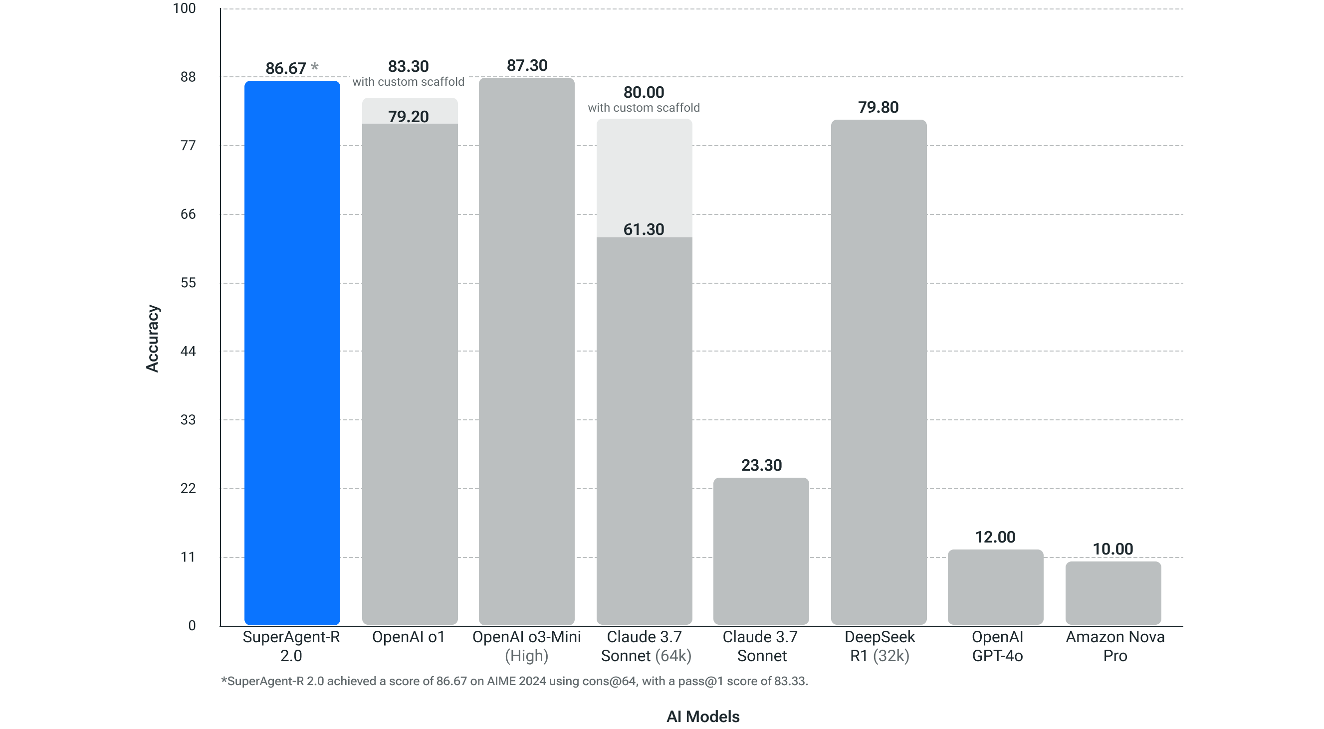 For Competitive Math, a determinant of reasoning capability, our testing has shown that SuperAgent-R 2.0 is exceeding the performance of OpenAI O1, Sonnet 3.7 (64k extended thinking), DeepSeek R1 models and SuperAgent-R 2.0 is on-par with OpenAI O3-high reasoning model. OpenAI has published data that a model that is good at Competitive Math such as AIME 2024, will be good at autonomous agentic workflows.